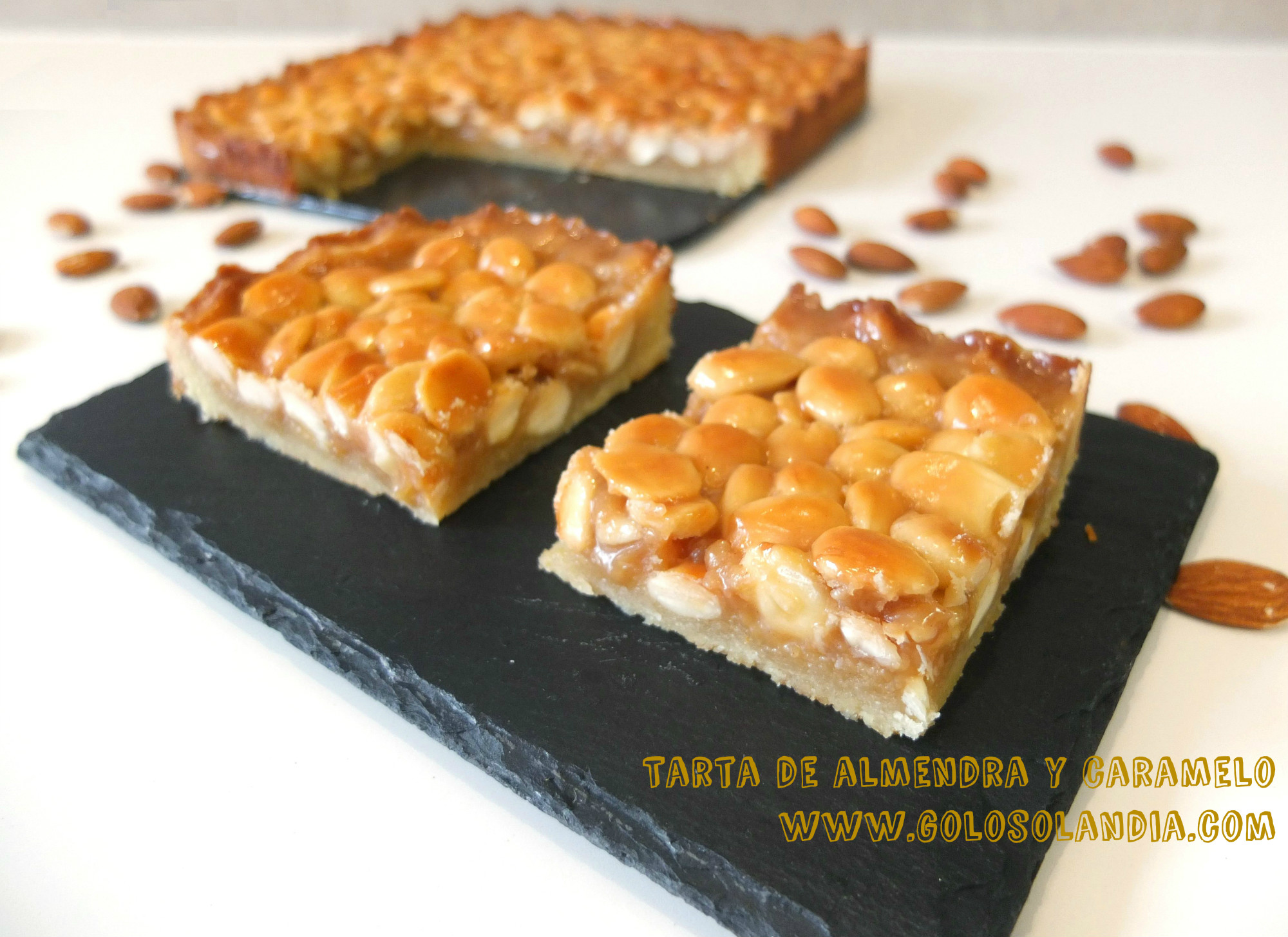 El cremoso caramelo se une a las almendras y una masa casera para formar una tarta deliciosa.