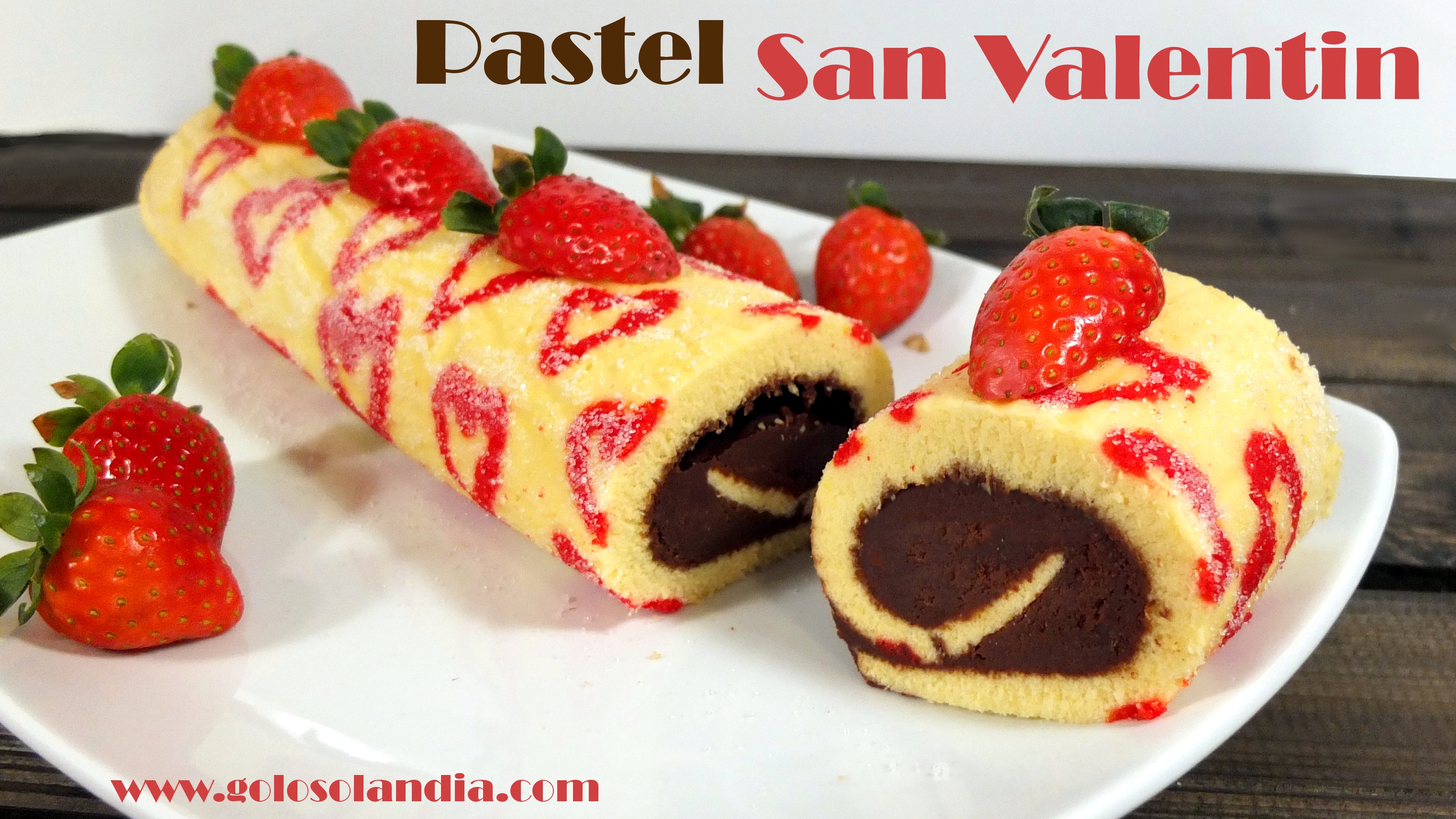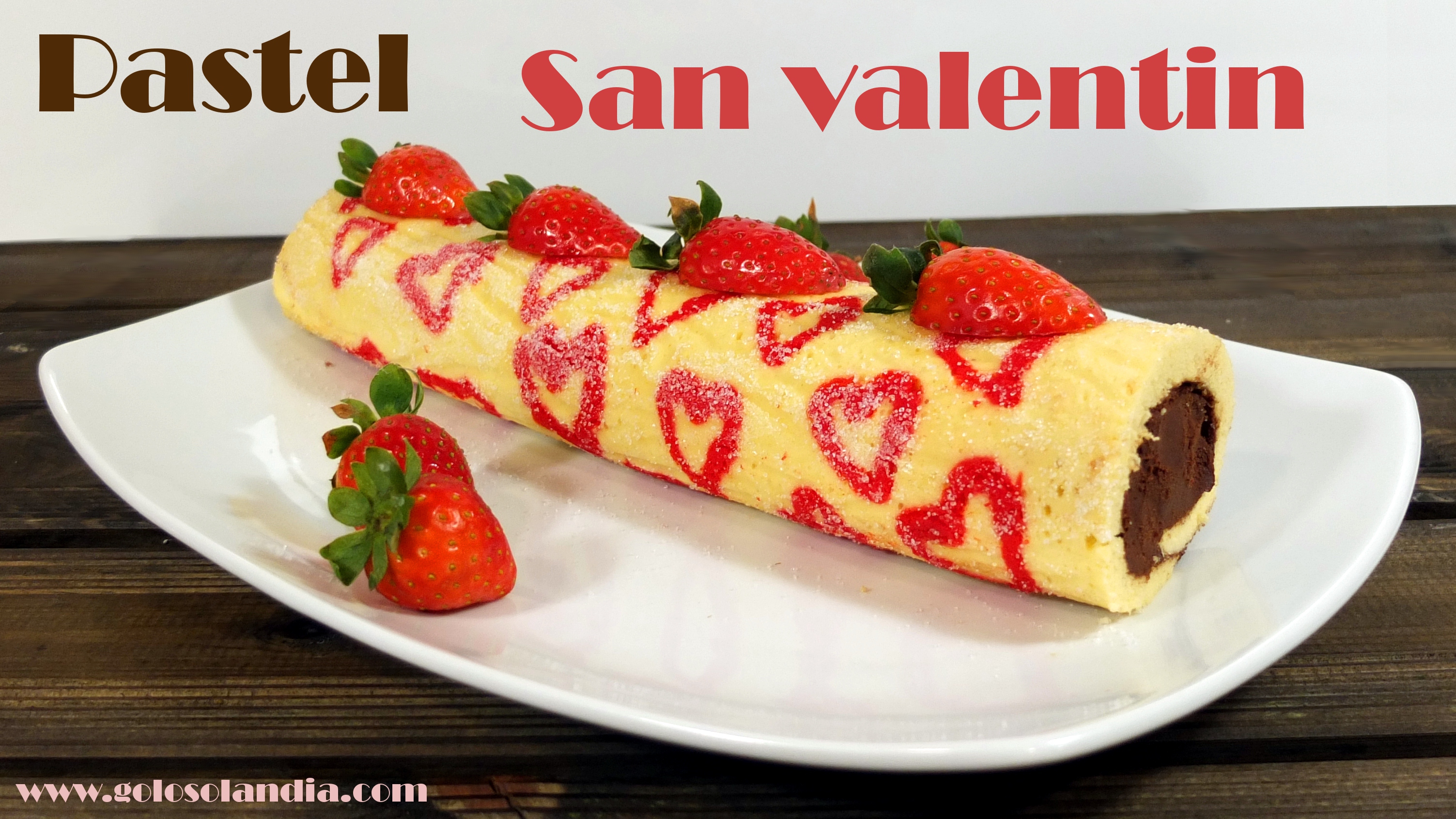 Sorprende con un regalo delicado y delicioso. Un brazo de gitano relleno de chocolate decorado con unas fresas y corazones. Una idea genial para el 14 de febrero.